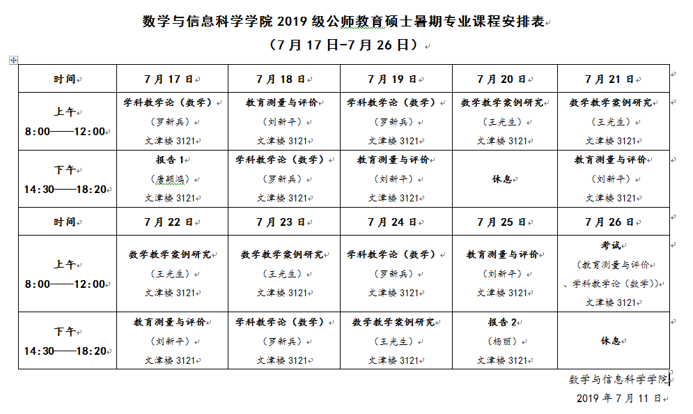 数学与信息科学公司2019级公师教育硕士暑期专业课程安排表