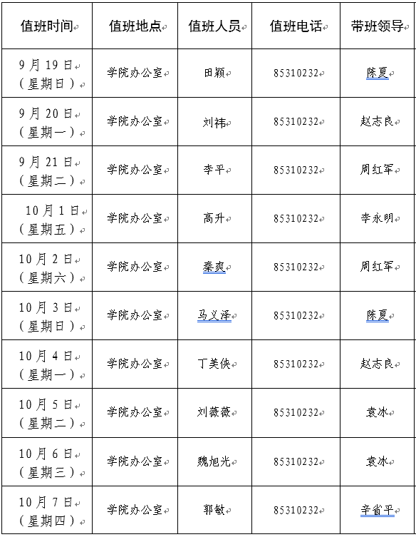 注意事项:1、按时上下班;2、保持办公场所干净整洁;3、注意安全和防火,每天定时巡查公司办公场所;4、做好假期信件的收发工作,每周一、周四取信件;5、每周五给花浇水一次;6、值班结束时须做好办公室钥匙的交接工作;7、遇紧急突发情况,及时向相关领导汇报。