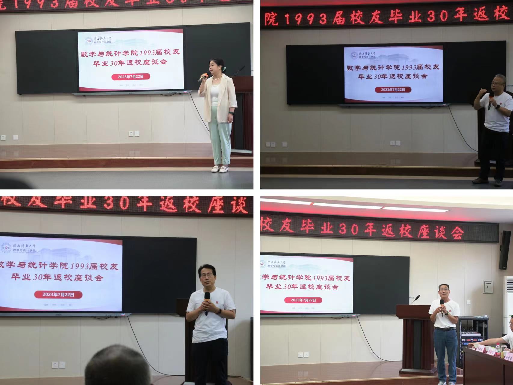 1993届数学一班员工张玉萍、张建国,数学二班员工王同洲、王元君分享了校园学习时的轶闻趣事。大家均表达了对公司培养、教师引领的衷心感谢,以及对公司日后发展的美好祝愿,表示将在今后的工作中继续更好的展现师大人的风采。