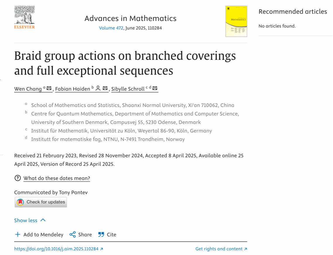 近日,公司常文教授与德国科隆大学Sibylle Schroll教授、南丹麦大学Fabian Haiden教授合作在《Advances in Mathematics》(数学进展)在线发表题为“Braid group actions on branched coverings and full exceptional sequences”(分歧覆盖和全例外序列上的辫子群作用)的文章。该文考虑了曲面的Fukaya范畴,将辫子群作用的可迁性转化为曲面两种映射类群的同构性,利用曲面拓扑学的结论给出了辫子群作用不可迁的一大类反例,最终证伪了Bondal-Polishchuk猜想。