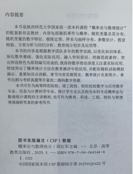 本教材是主编带领教学团队结合十余年的教学改革实践,从优化知识体系、深化数学基础、强化实际应用、融入学科前沿、挖掘思政素材、突出师范特色等方面编写的,既保持数学理论深度又注重实际应用,特别突出了概率统计方法在教育测评中的应用,并配有随机试验模拟演示、重要知识点讲解、章节内容发展简史、概率统计名家简介、章节自测与考研真题等丰富的二维码数字资源。