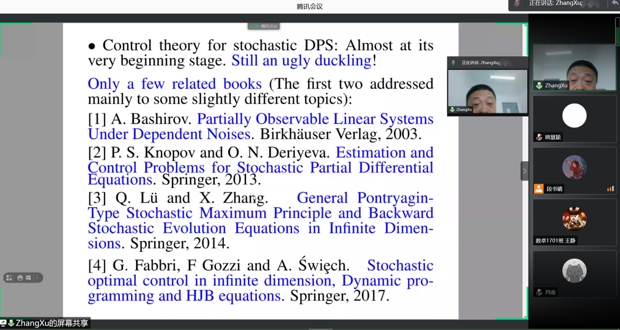 5月12日下午,应公司邀请,国际数学家大会45分钟报告人四川大学张旭教授通过腾讯会议在线为公司师生作了题为《随机分布参数系统控制理论简介》的学术报告。报告由副经理赵志良教授主持,公司吴保卫教授、高兴宝教授、刘丽丽副教授、陈森讲师,西安交通大学、西北工业大学、西安电子科技大学等高校的同行学者和相关专业的研究生、高年级本科生等150余人聆听了本次报告。
