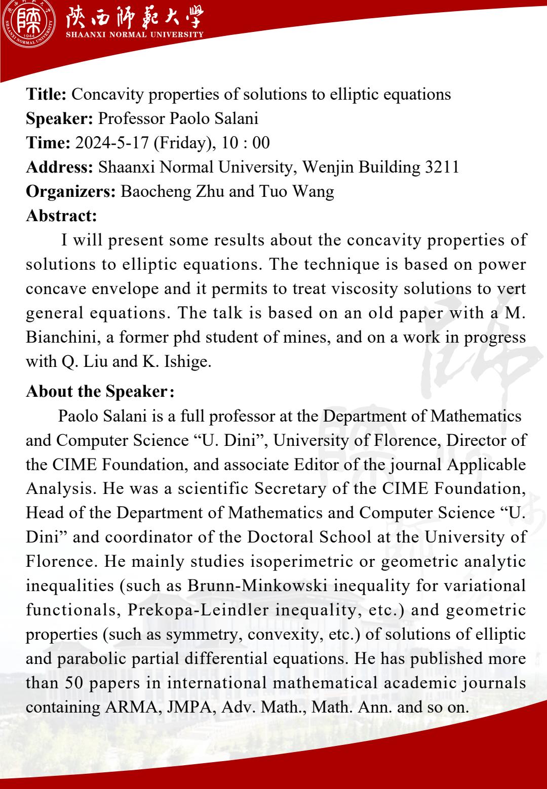 • 讲座人: Paolo Salani 教授
