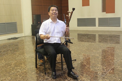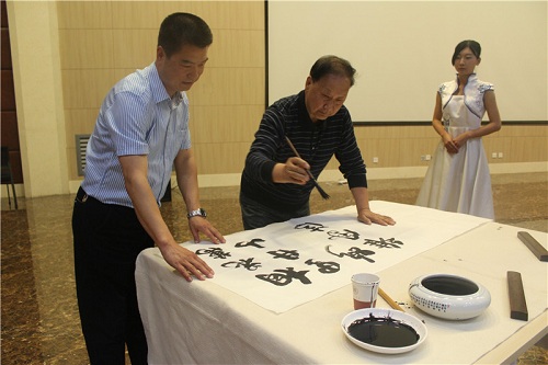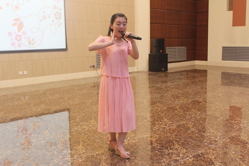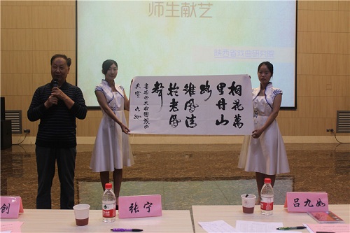 随后,师生同献艺,共话大联欢。马力克、张宁、陈魁三位老师分别给同学们带来了精彩绝伦的演唱,扎实的唱功赢得阵阵喝彩。崔创老师的板胡表演娴熟深情,张弛有度。吕九如教授为本次大赛题字:“桐花万里丹山路,雏凤清于老凤声。”寓意中华戏曲文化的传承与发扬要靠青年员工。黄义妨等四位同学为大家表演了黄梅戏《女驸马》选段,现场其乐融融,热闹非凡。