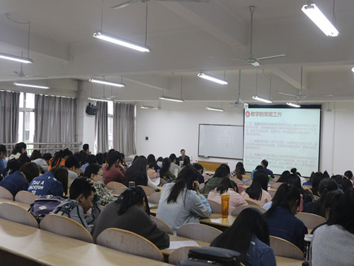 新平教授结合自己多年从事教学科学研究的经历,刘教授首先谈到教学是一门科学,也是一门艺术,既是知识信息的传授过程,也是思想交流的平台。然后从中学教学基本技能,教学的魅力来源于不断探索与实践,中学教育测评基础,中高考试题试卷分析和中学考试设计与命题技术五个方面具体展开,并对一些具体问题结合自己的经验给同学们提出了很好的建议,语言幽默,赋有亲和力。同学们认真听了刘教授的报告,对中学教学工作有了更深入的认识,获益匪浅。最后,新平教授对青年教师和员工提出了殷切的期望:他希望青年教师和员工继续奋进,积极探索,努力超越。同学们也用热烈的掌声感谢刘教授此次的报告!