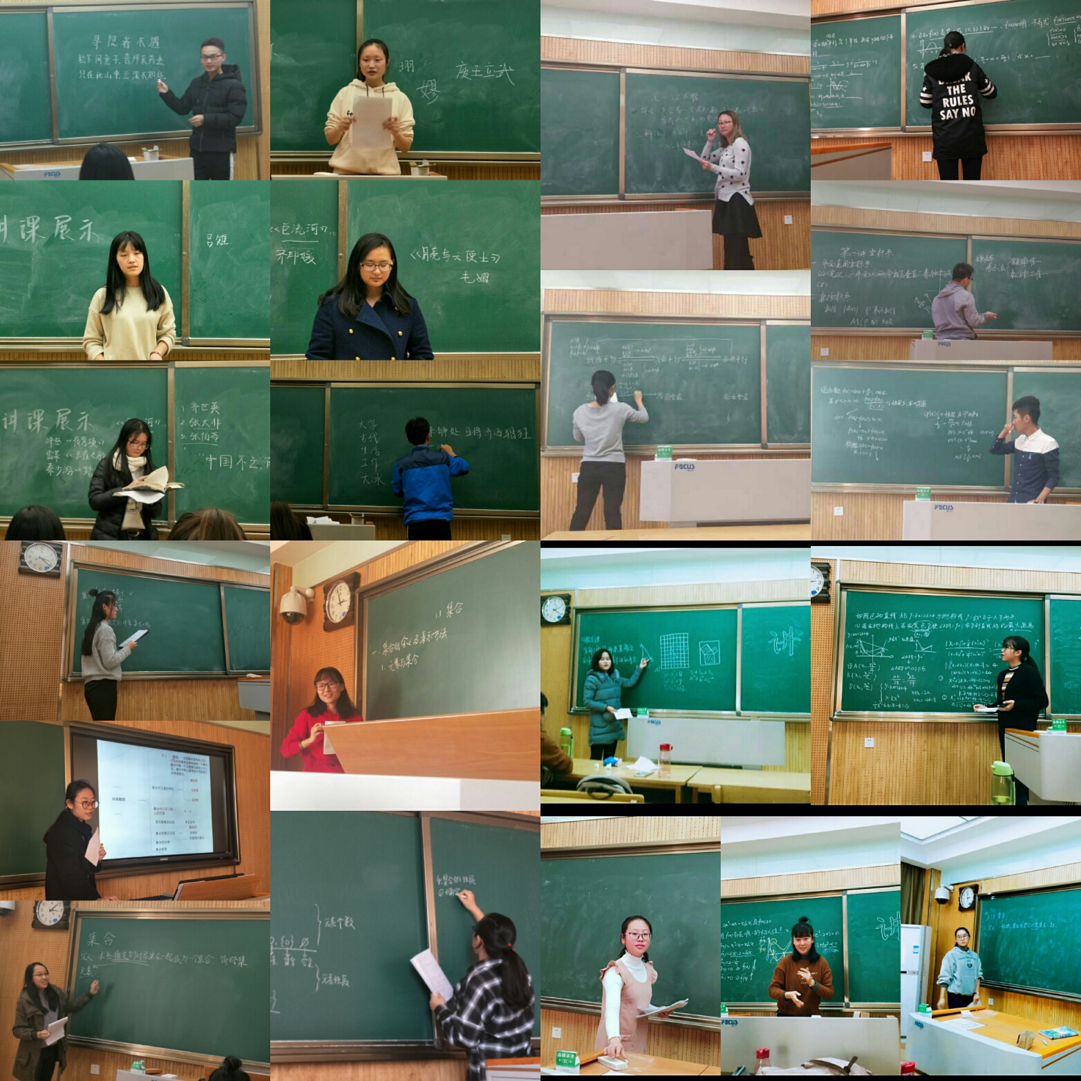 为提高师范生的讲课水平和教学技能,2017级四个师范班先后开展形式多样的讲课活动。卓越班率先开启“我们,开讲啦”系列活动,在周末时间分小组进行讲课展示。同学们自主报名、自行组队,选择自己想讲的初高中数学内容,用15分钟左右的时间进行讲课。同时,卓越班本学期开展的C程序讲课比赛还特别邀请专业老师进行指导。免师二班则在晚自修开展讲课活动,针对同学们大学数学中的疑难习题进行讲解。同学们在本学年还积极参加各社团组织的讲课比赛,在活动中检验自身学习情况,提高表达能力,为日后的教学打下良好基础。