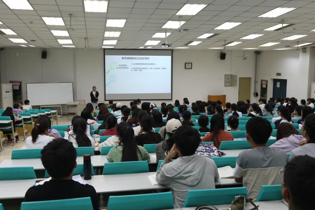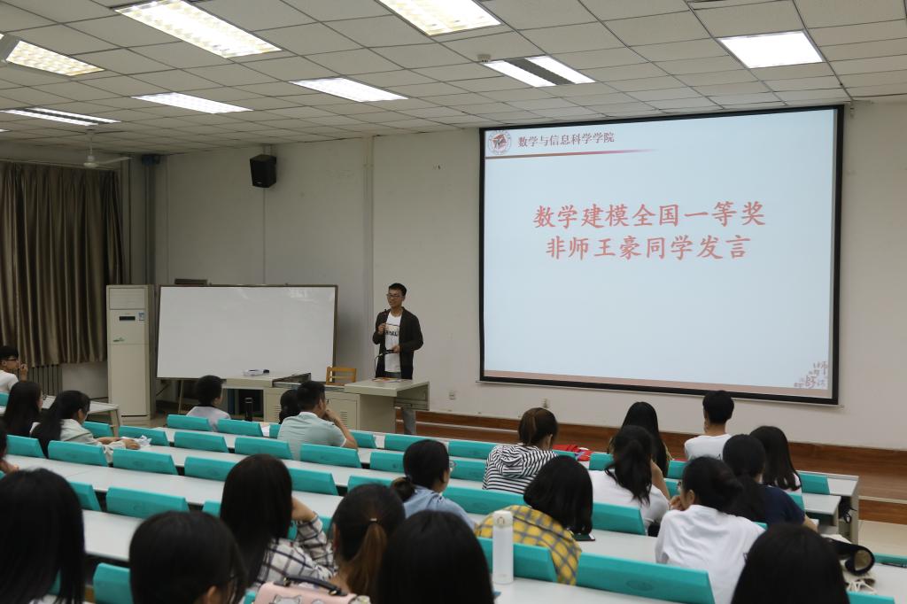 随后,王豪以现场同学注意力转化的例子,生动直观地引入了数学建模的主题,并几个建模实例为依托,对建模的重要思想进行深入而透彻的讲解,他还提到团队组建三个要点,重点强调了团队沟通的重要性。