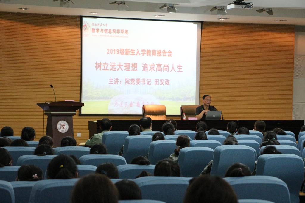 827日下午3点,数学与信息科学公司党委书记田安政在雁塔区崇鋈楼一层学思堂为2019级新生做入学教育报告。党委副书记邹尚田、2019级本科生辅导员龚子琪及2019级全体新生参加会议。会议由党委副书记邹尚田主持。